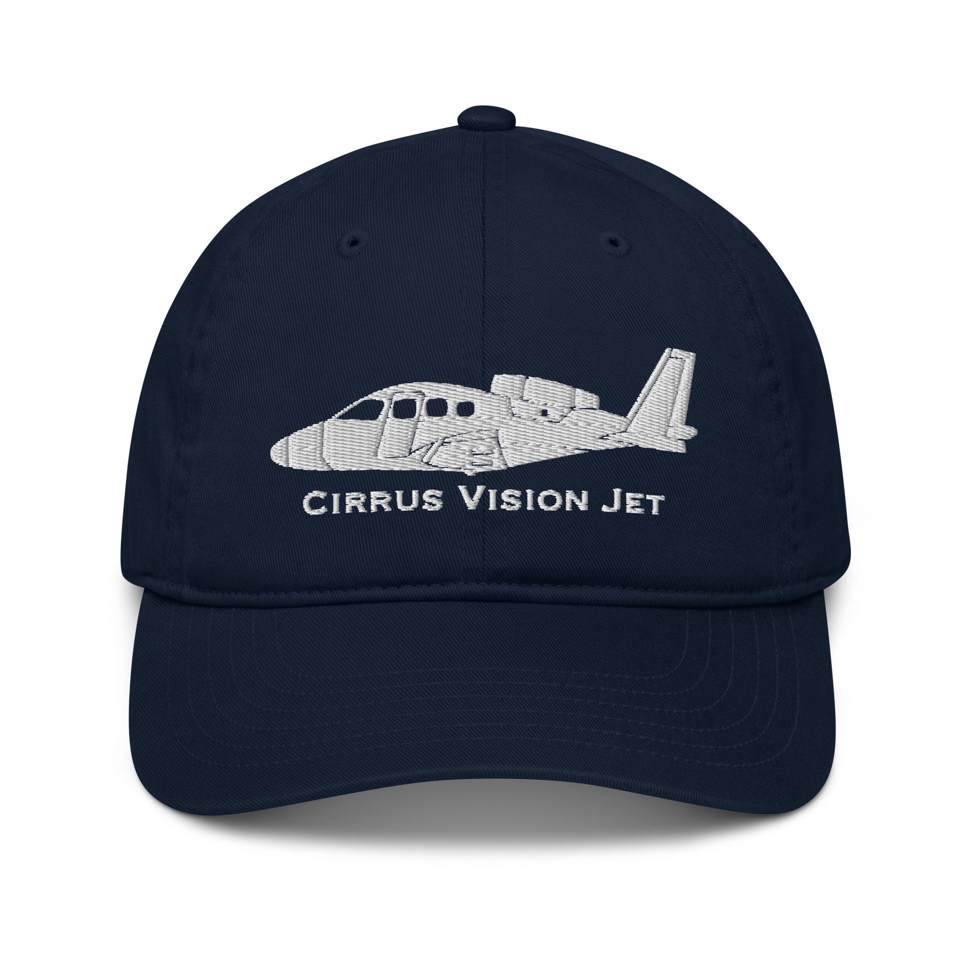 Our custom Cirrus Vision Jet SF-50 Embroidered Hat has a detailed airplane profile image with the make and model written below the airplane image in a distinctive font. Tell everyone how proud you are flying this dream flying machine. This is a custom designed ball cap by the SkyboundGear artist. No other hat we have seen captures the distinctive side-profile detail of this plane. How cool is that?