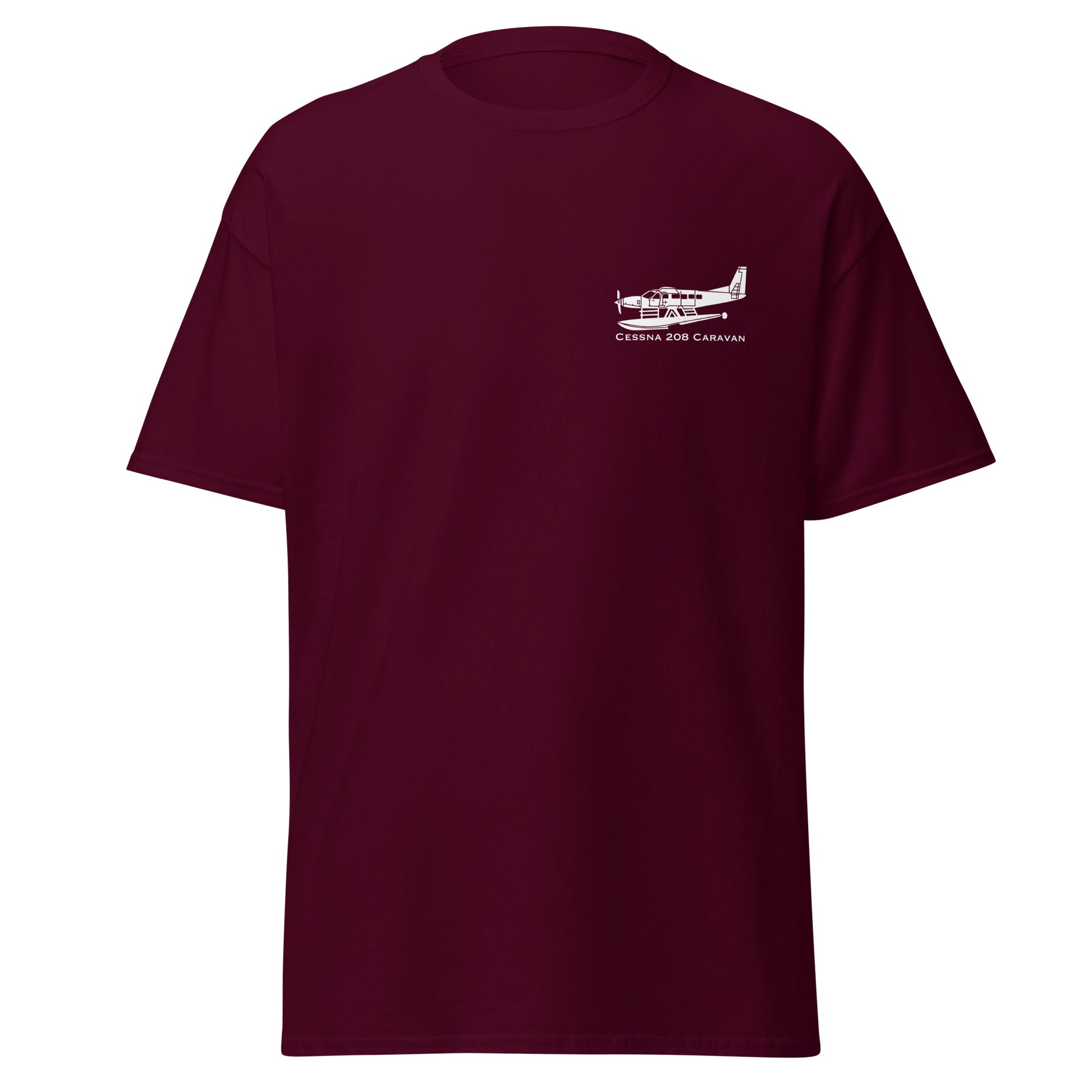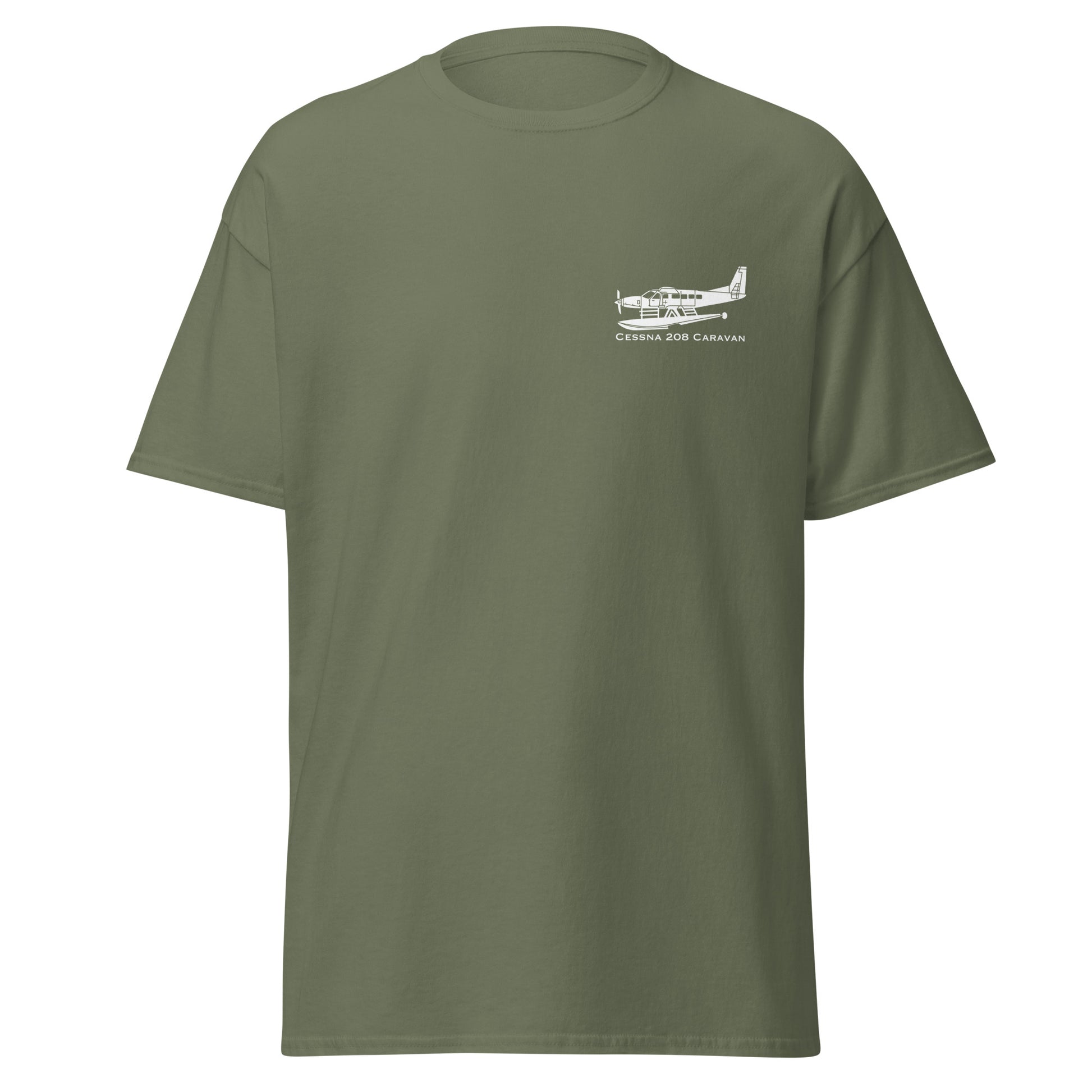 Our Custom Cessna 208 Caravan on Floats T-Shirt has a 4 inch width detailed airplane profile image on the left chest with the make and model below the airplane image. Tell everyone how proud you are flying this dream flying machine. This is a custom designed shirt by the SkyboundGear artist. No other shirt we have seen captures the distinctive side-profile detail of this plane. How cool is that?