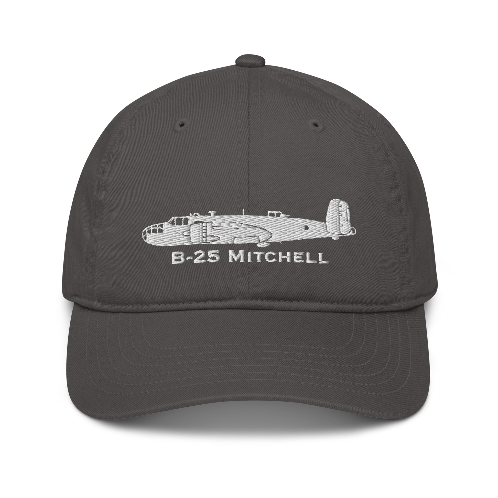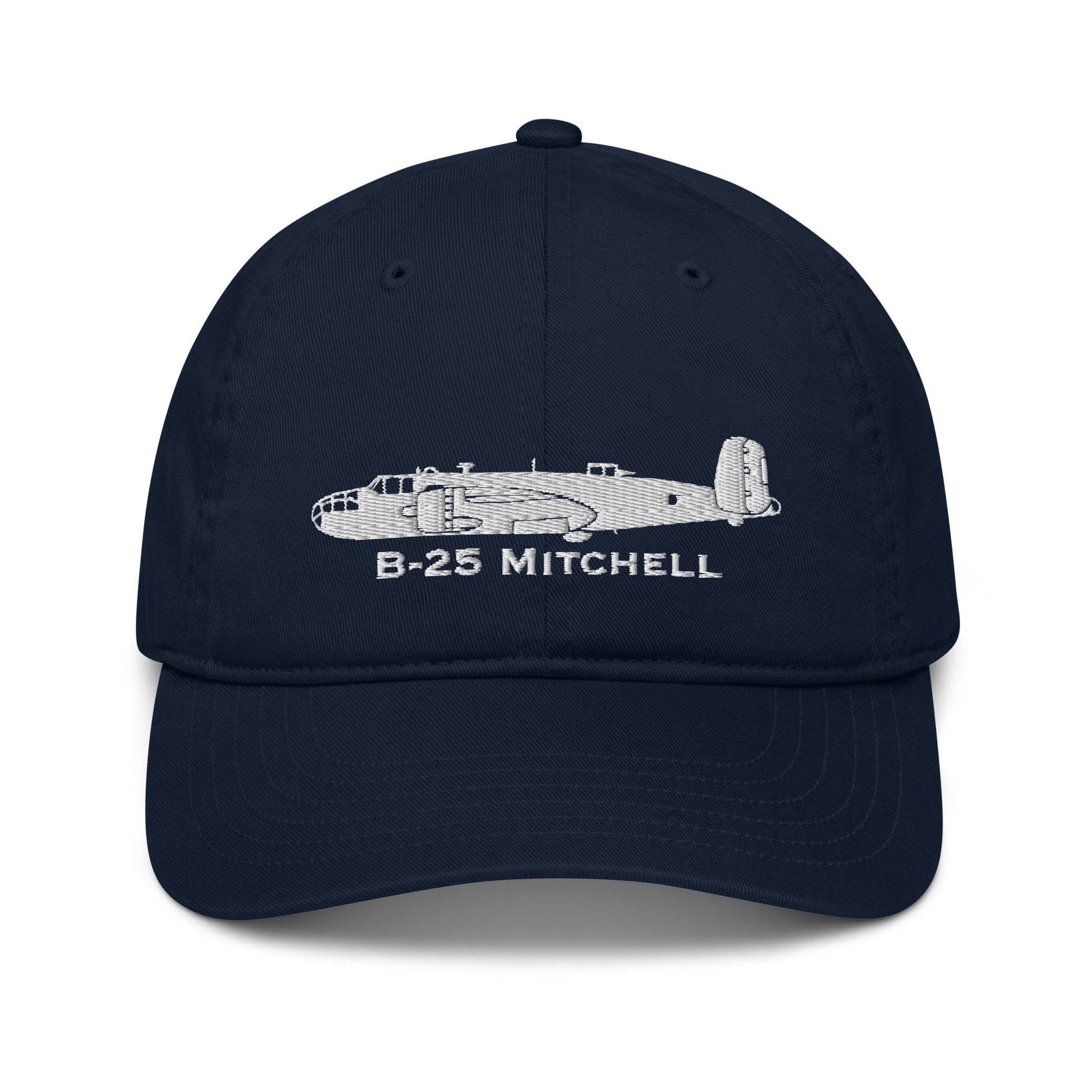 Our custom North American B-25 Mitchell Embroidered Hat has a detailed airplane profile image with the make and model written below the airplane image in a distinctive font. Tell everyone how proud you are flying this dream flying machine. This is a custom designed ball cap by the SkyboundGear artist. No other hat we have seen captures the distinctive side-profile detail of this plane. How cool is that?